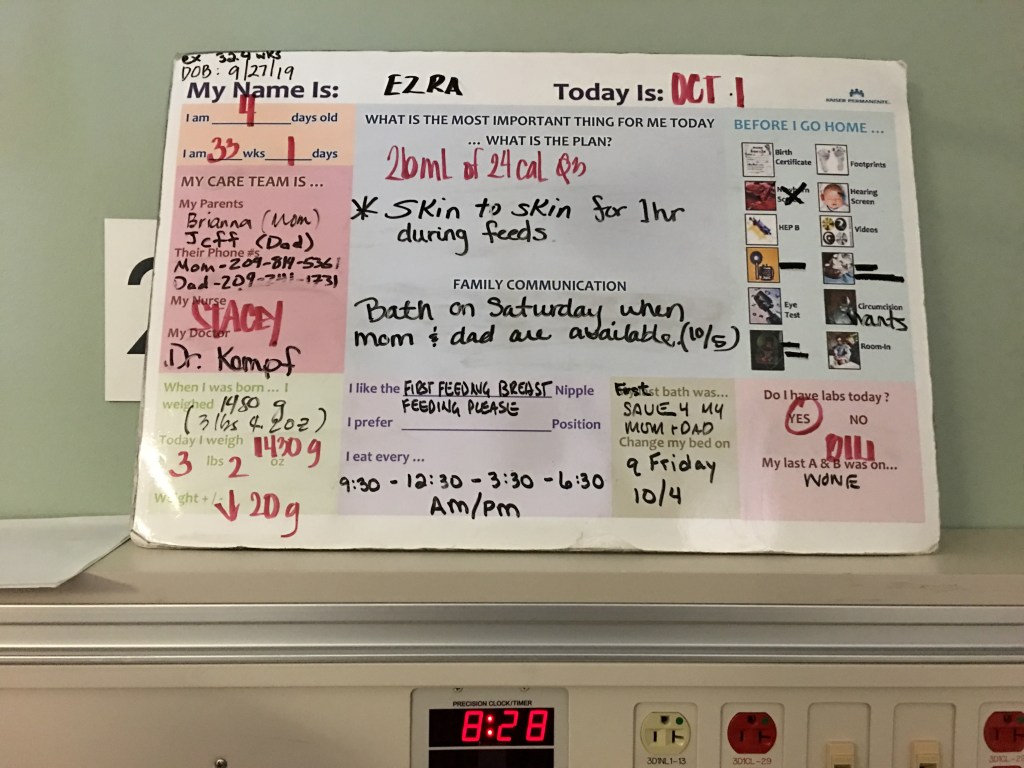 Around 28 weeks, the day after Labor Day at a routine monitoring appointment Ezra’s heart started having decelerations and I started having contractions. They told me to go straight to labor and delivery. What was supposed to be a quick visit to labor and delivery turned into 16 days of bed rest, 24/7 monitoring and two shots a day in my stomach to fight the pre-eclampsia. I also received the first set of steroid shots to push along development of Ezra’s brain and lungs. His heart though continued to have multiple decels in 24 hour time frames, and my severe pre-eclampsia didn’t improve.